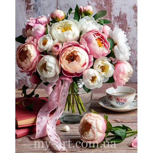 Теги: Алмазна мозаїка 50 х 40 см на підрамнику Ніжний букет півоній у вазі (+ стрази голограмні +FD) (арт. TNG1724), My-Art, Квіти букети вазони алмазна вишивка